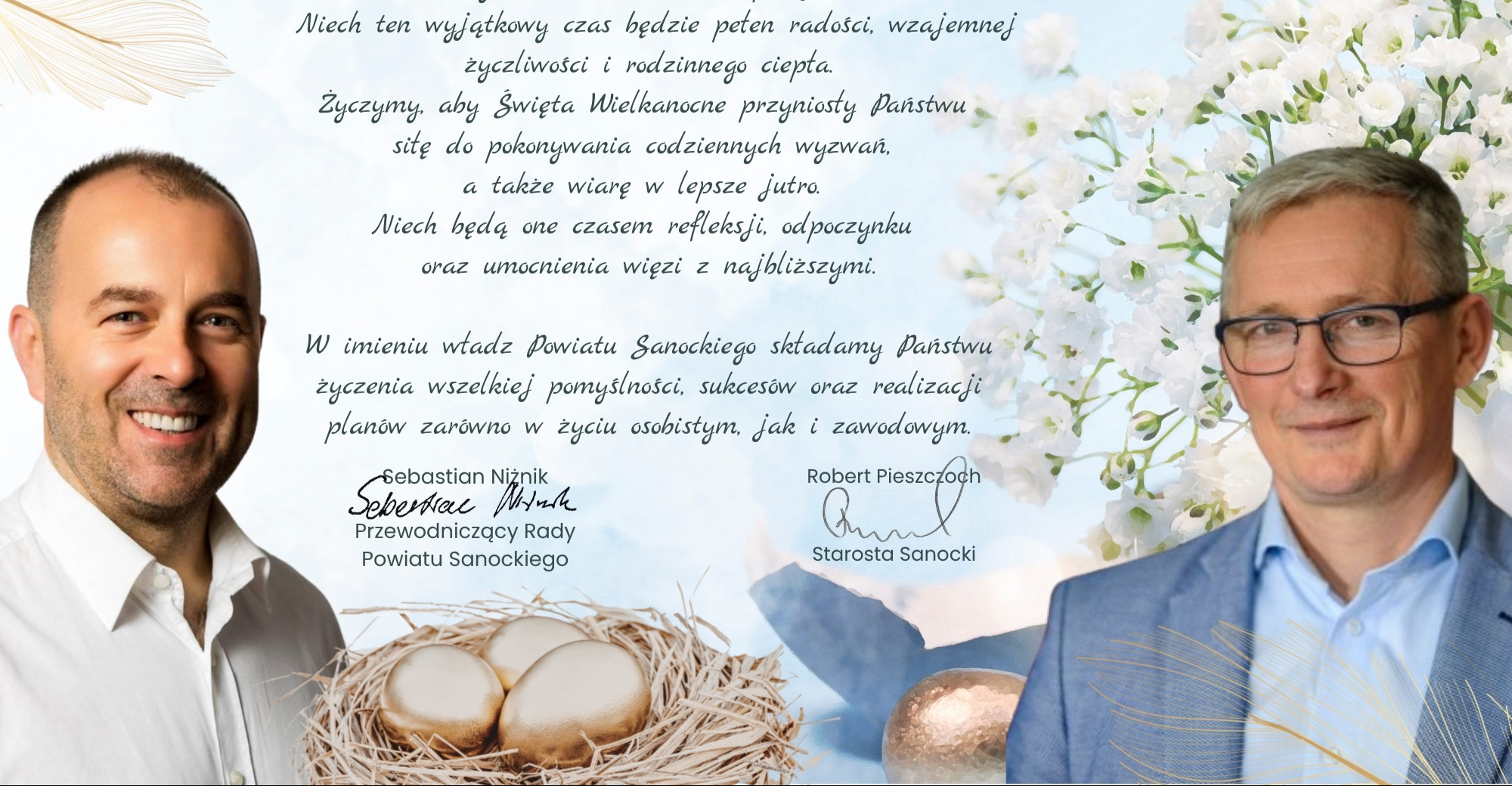 Z okazji Świąt Wielkanocnych najserdeczniejsze życzenia zdrowia, pogody ducha oraz głębokiego spokoju wszystkim Mieszkańcom powiatu sanockiego składają Starosta Sanocki Robert Pieszczoch oraz Przewodniczący Rady Powiatu Sanockiego Sebastian Niżnik.